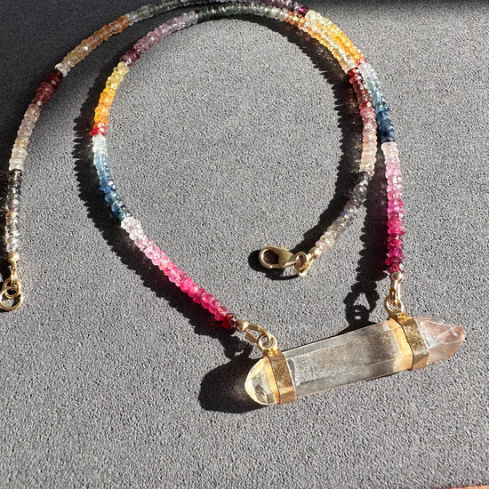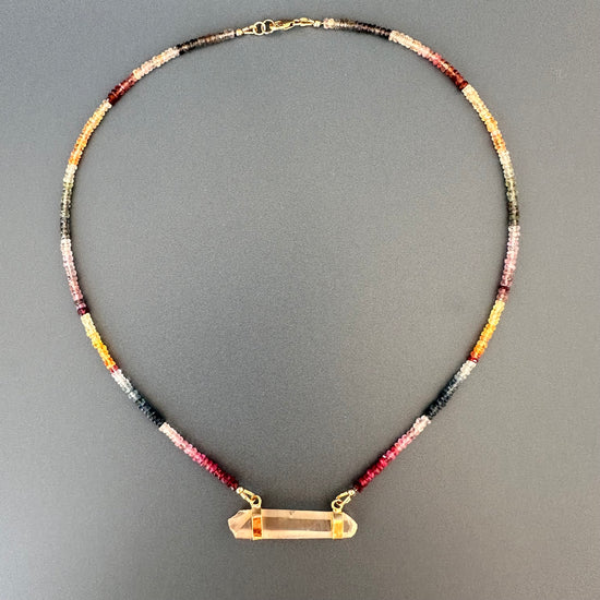 Multicolor sapphire necklace with pink lemurian horizontal connector